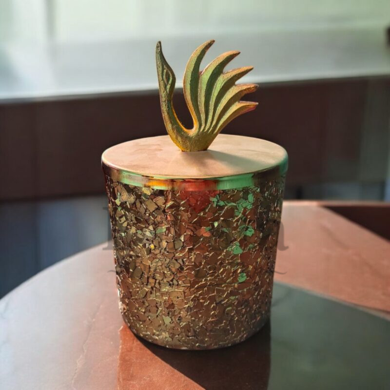 Premium decorative glass jar with metal fitting, ideal for home décor, gift hampers, festive gifting, and luxury storage. Available in all colors with a stylish design.