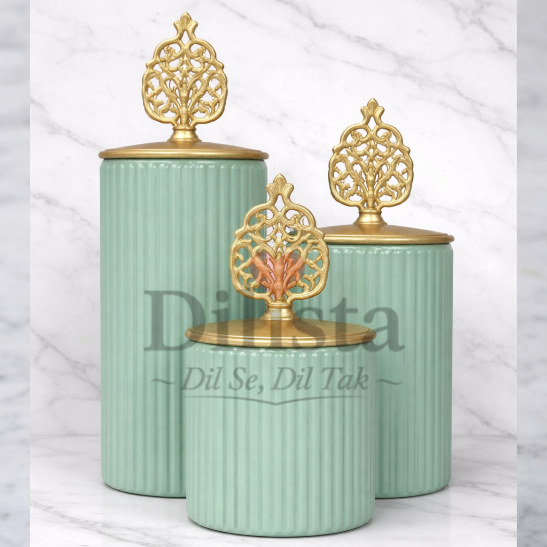 This decorative glass jar set of 3 is designed for premium hamper packaging and stylish home décor. Finished in a rich green matte color, each jar comes with a metal lid and decorative knob, adding a modern yet elegant touch. With capacities ranging from 500ML to 1000ML and heights of 4, 5, and 6 inches, this set is perfect for packing dry fruits, sweets, chocolates, or for use as decorative storage jars. A popular choice for festive gifting, wedding hampers, return gifts, and bulk B2B orders.