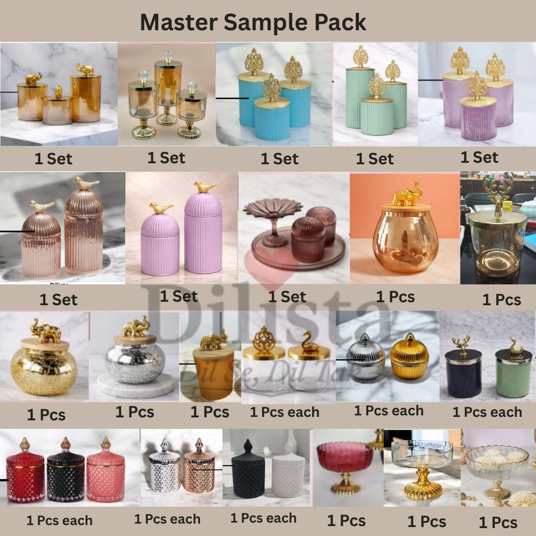 This exclusive pack includes multiple designs, sizes, and finishes in decorative jars, candy jars, bowls, and trays—helping you present professional samples for gifting, festive hampers, corporate hampers, and retail displays.